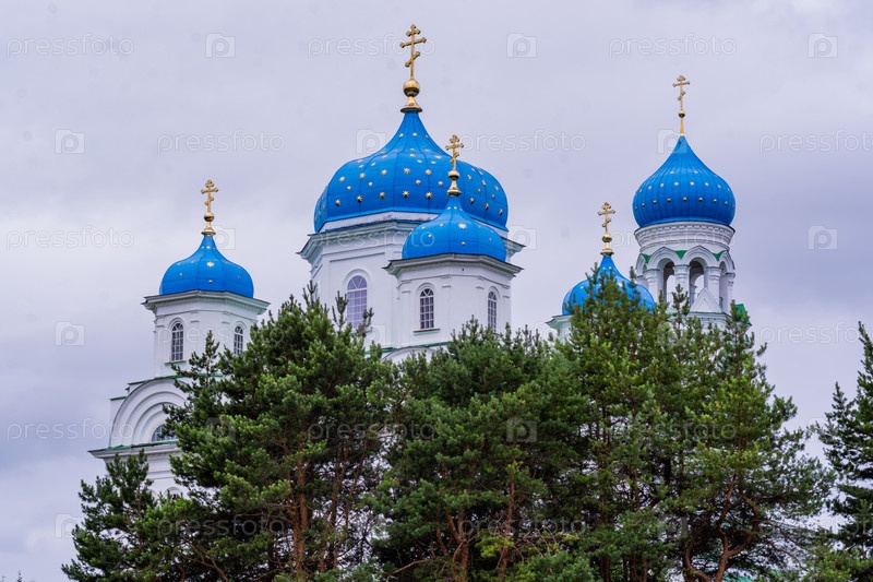 2023 год. Россия, Тверская область, город Торжок. Благовещенская церковь с небесно-голубыми куполами. Церковь на холме. Церковь Благовещения Пресвятой Богородицы. Благовещенский (Михаилоархангельский) храм. Святые места. 2023 год. Россия, Тверская область