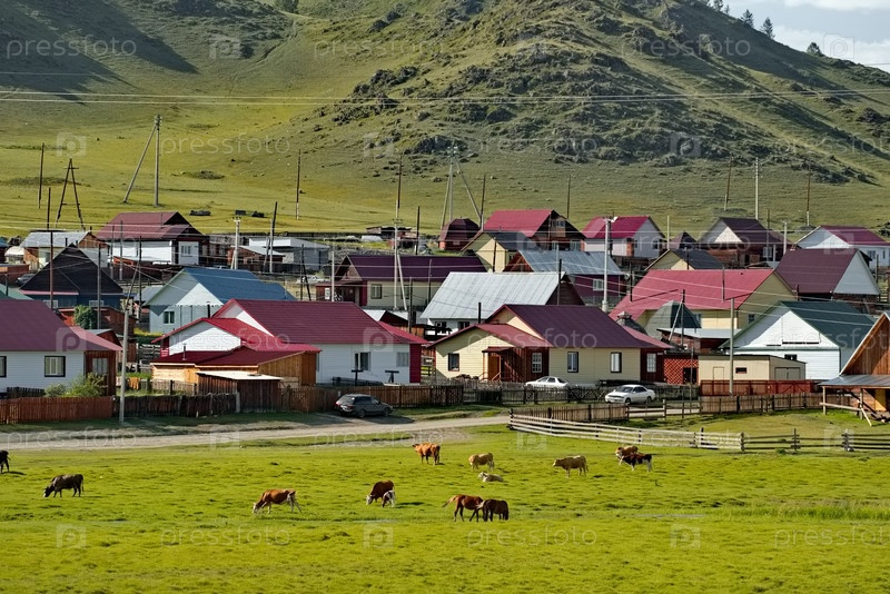 Стадо породистых коров пасется в долине реки Кан возле одноименного поселка у подножья гор Алтая