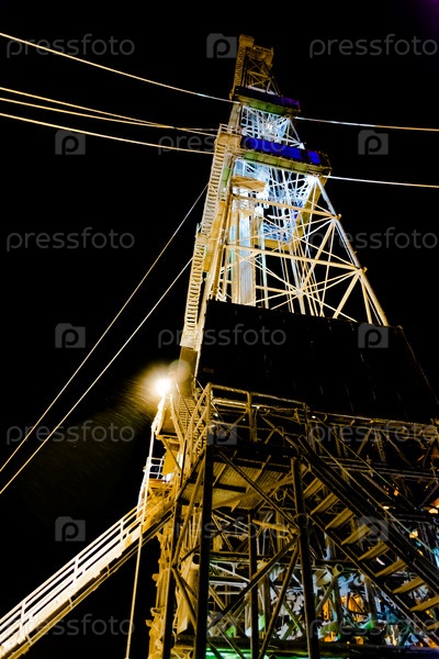 Буровая установка для нефти и газа с ночным освещением. Зимняя полярная ночь. Размытые контуры заснеженной техники