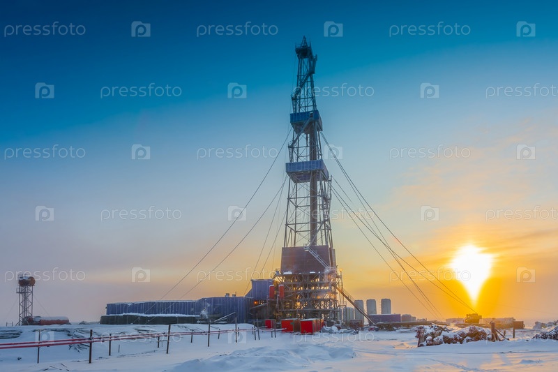 Зимний полярный день в Арктике. Бурение скважины на северном нефтегазовом месторождении. Низкое солнце. Красивое освещение