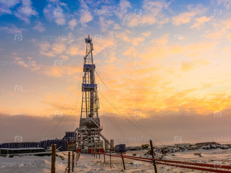 Зимний полярный день в Арктике. Бурение скважины на северном нефтегазовом месторождении. Низкое солнце. Красивое освещение