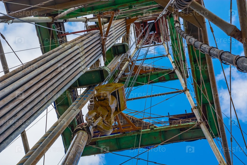 Расположение оборудования внутри буровой установки для бурения нефти и газа. Вертикальные бурильные трубы. Подъемная система. Вид снизу вверх. Голубое облачное небо