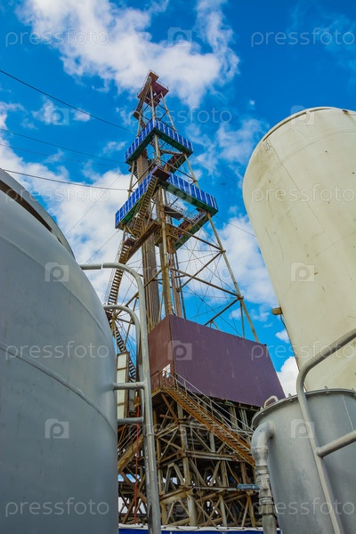 Буровая установка с башней-башней. Внизу находится буровое оборудование. На северном месторождении для добычи нефти и газа бурят глубокую скважину. На переднем плане бункеры для цемента