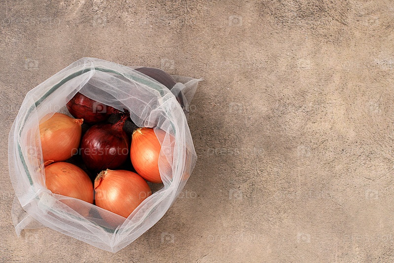 Различные сорта лука в тканевой упаковке. Здоровые натуральные продукты в эко-сумке для повышения иммунитета, концепция здорового образа жизни, нулевые отходы. Баннер для магазина. Нет пластика