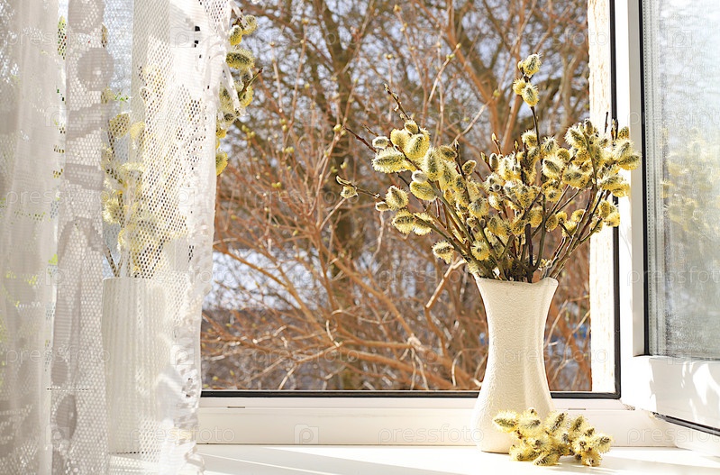 Весенняя цветочная композиция, натюрморт, концепция праздника с цветами, баннер с нежными цветами ивы на солнечном окне. Открытка на Пасху, День матери, С Днем Рождения