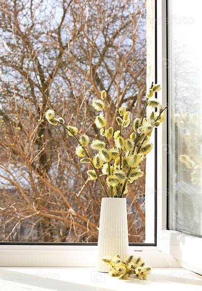 Весенняя цветочная композиция, натюрморт, концепция праздника с цветами, баннер с нежными цветами ивы на солнечном окне. Открытка на Пасху, День матери, С Днем Рождения