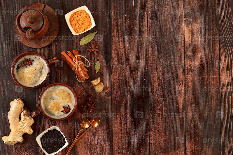 Индийский чай масала чай с молоком, имбирем, анисом и корицей на старом деревянном столе. Традиционный напиток со специями, концепция кафе, реклама ресторана и меню