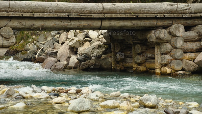 Крупный план бревенчатого моста, больших камней и чистой горной реки. Мост построен по старинной технологии без использования гвоздей. Красивая зеленоватая вода в реке
