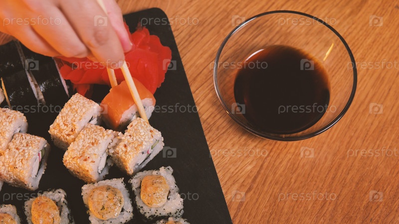 Набор вкусных японских суши-роллов на черной каменной доске. Вид сверху. Палочки для еды используются для извлечения суши из набора. Рядом стоит миска с соевым соусом
