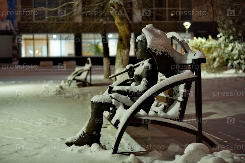 Новокузнецк. Россия. Ноябрь 01, 2023. Заснеженная скульптура Девушки с зонтом и учебником сидящей на лавочке в парке местного университета
