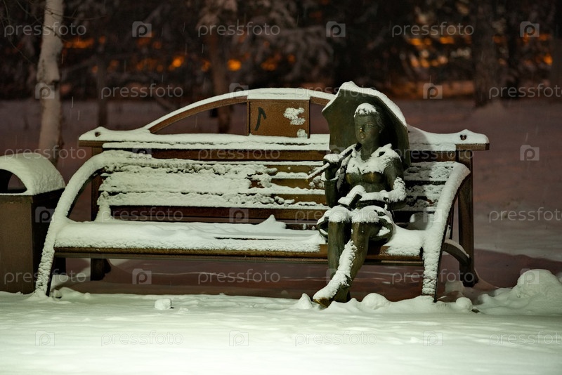 Новокузнецк. Россия. Ноябрь 01, 2023. Заснеженная скульптура Девушки с зонтом и учебником сидящей на лавочке в парке местного университета