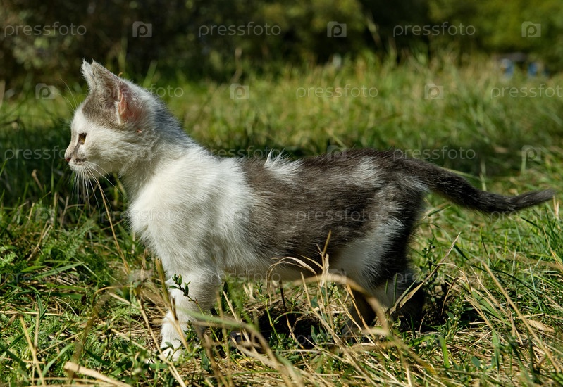 Россия. Северный Кавказ. Маленький котенок осваивает навыки охоты на заросшем травой лугу