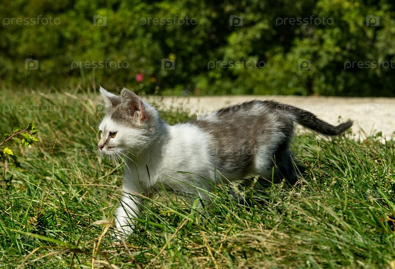 Россия. Северный Кавказ. Маленький котенок осваивает навыки охоты на заросшем травой лугу