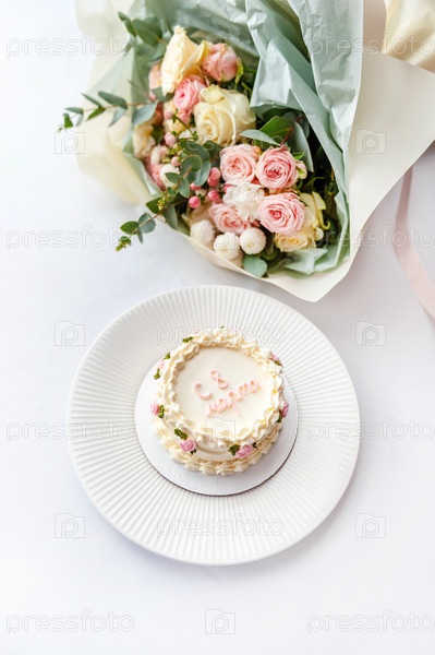 Праздничный торт бенто и букет на светлом фоне