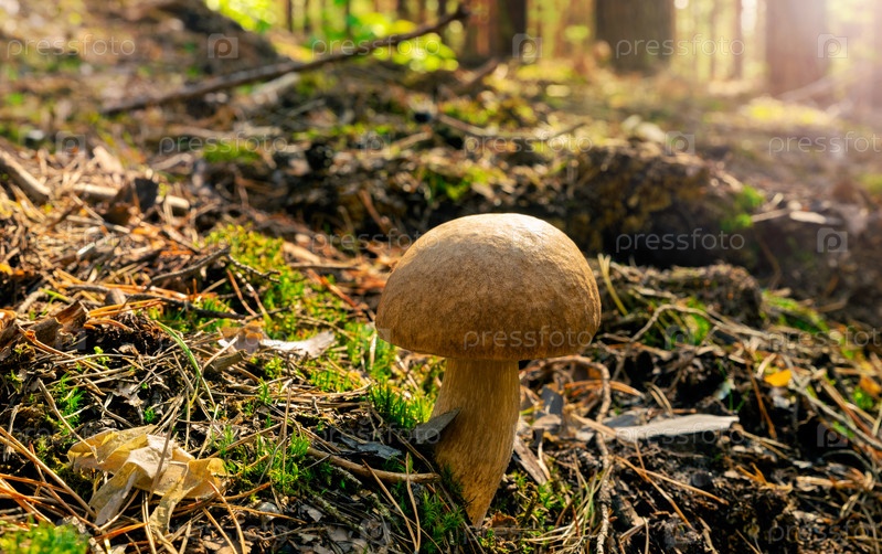 Белый гриб в сосновом осеннем лесу. Боровик Эдулис. Съедобный гриб, освещенный ярким солнцем. Крупный план. Мягкий фокус