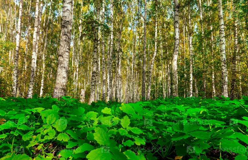 Осенний пейзаж в березовой роще с зеленой травой на переднем плане. Сезонная солнечная погода. Желтая и зеленая листва