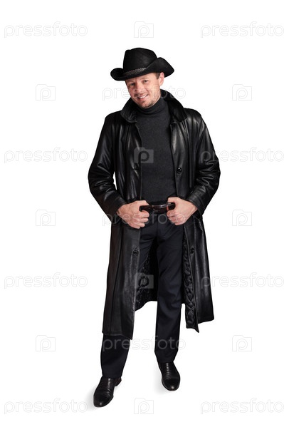 Ковбой в черной кожаной одежде, положив руки на пояс. Небритый улыбающийся мужчина в шляпе и плаще. Мачо на белом изолированном фоне