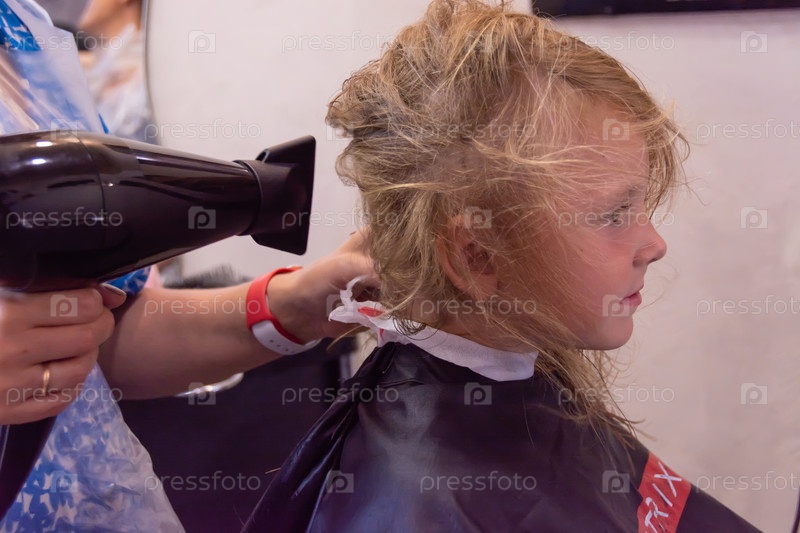 Парикмахер делает модную красивую прическу для ребенка. (2021 год). A hairdresser makes a fashionable beautiful hairstyle for a child