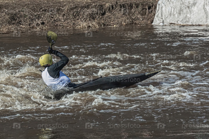 Серия изображений. Спортсмены на байдарках и байдарках покоряют бурные воды реки. Одет в водонепроницаемую одежду и шлемы. В руках они держат весло. Размытость