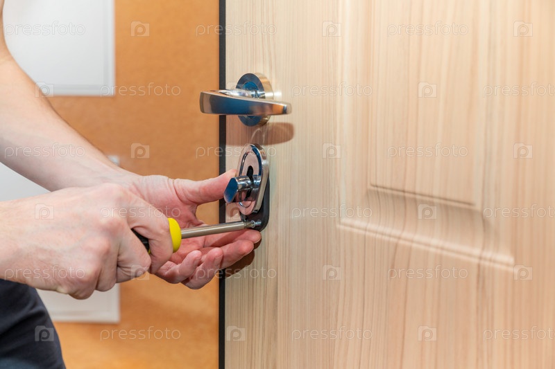Установка и замена дверных замков. Ремонт дверей. Слесарь устанавливает дверную фурнитуру, затягивая винт отверткой