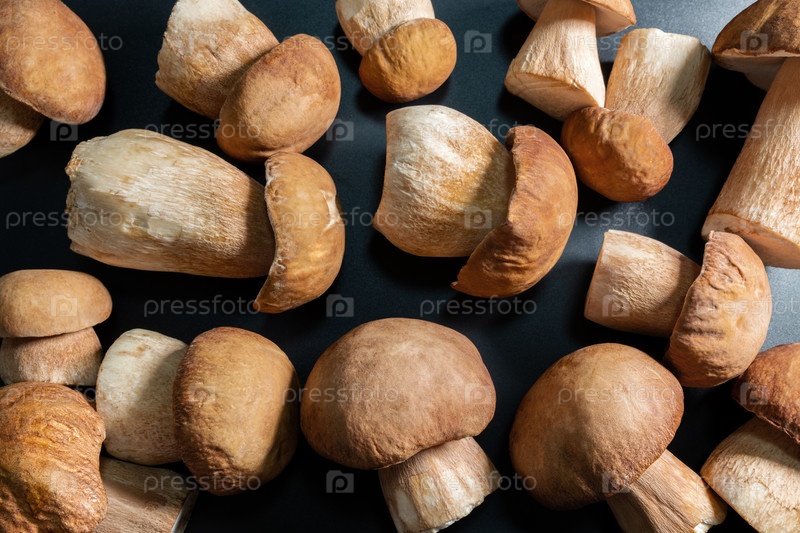 Белые съедобные грибы на черном фоне. Гриб из рода Boletus edulis. Растёт в сосновых и смешанных лесах