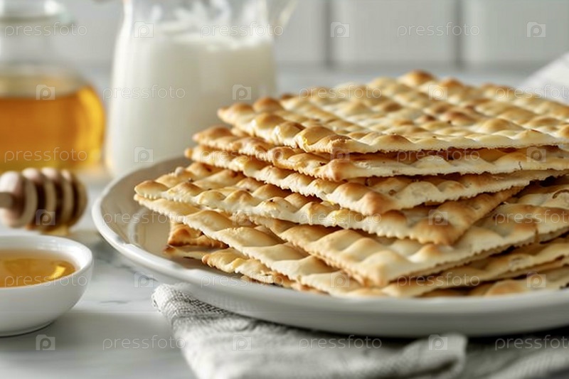 На светлом столе крупный план еврейской мацы в белой тарелке, рядом с медом и кувшином молока