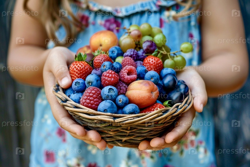 Руки девушки в синем цветочном платье, которая держит в руках корзину с фруктами и ягодами