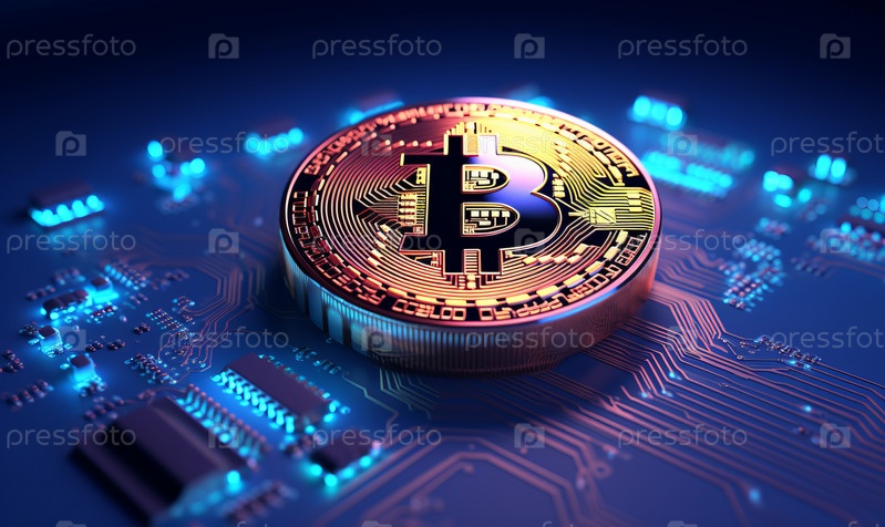 Монета Биткойн лежит на сложном наборе микросхем, метафорически представляющем процессы цифрового майнинга и транзакций криптовалюты