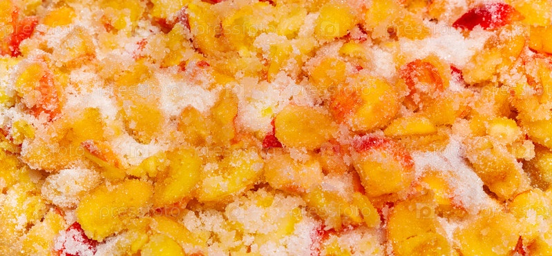 Свежие нарезанные яблоки посыпают белым сахаром. Приготовление яблочного джема. Фруктовый сахарный фон
