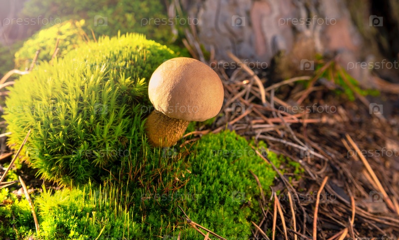 Белый маленький гриб в сосновом осеннем лесу на зеленом мхе. Боровик Эдулис. Съедобный гриб, освещенный ярким солнцем. Крупный план. Мягкий фокус