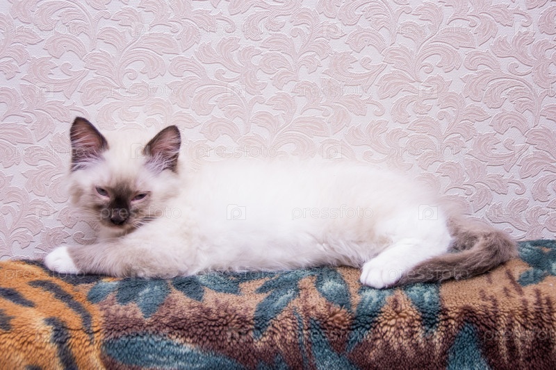 Красивый маленький котенок Рэгдолл отдыхает дома на диване