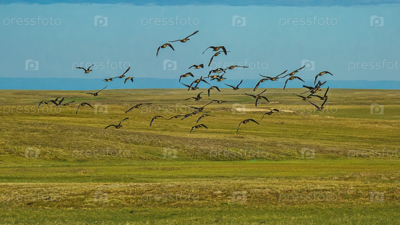 Стая диких гусей летит над северной летней тундрой на фоне голубого неба