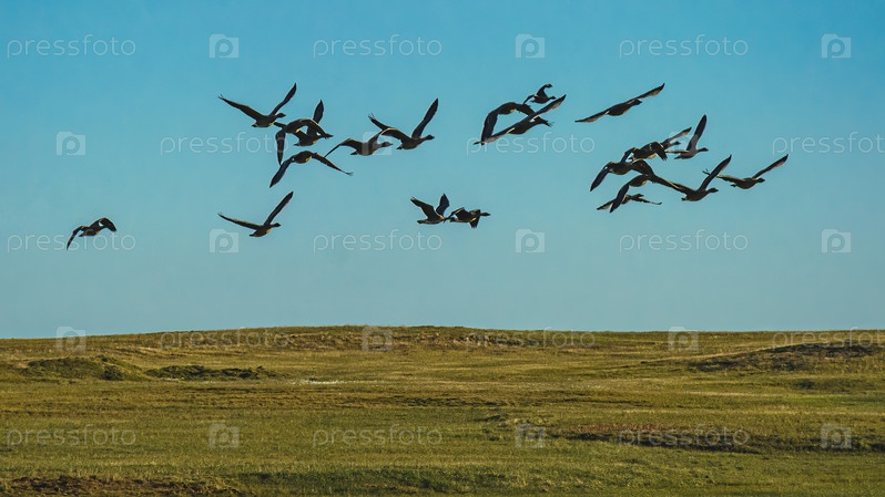 Стая диких гусей летит над северной летней тундрой на фоне голубого неба