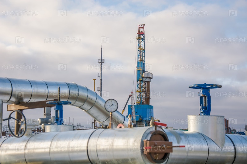 Оборудование и инфраструктура для добычи газа из скважин арктического месторождения. Зимний полярный день. Буровая установка на заднем плане