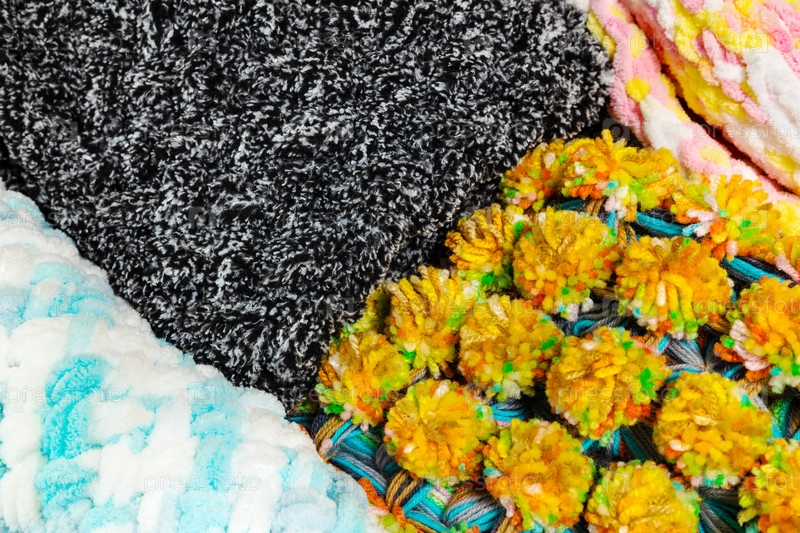 Вязаные теплые пледы. Фон тканого мягкого одеяла ручной работы. Текстура цветной пряжи
