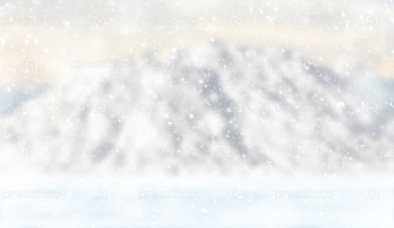 Зимний фон с сильным снегопадом. Абстрактный снег среди гор. Морозная снежная погода. Изображение с размытым фоном