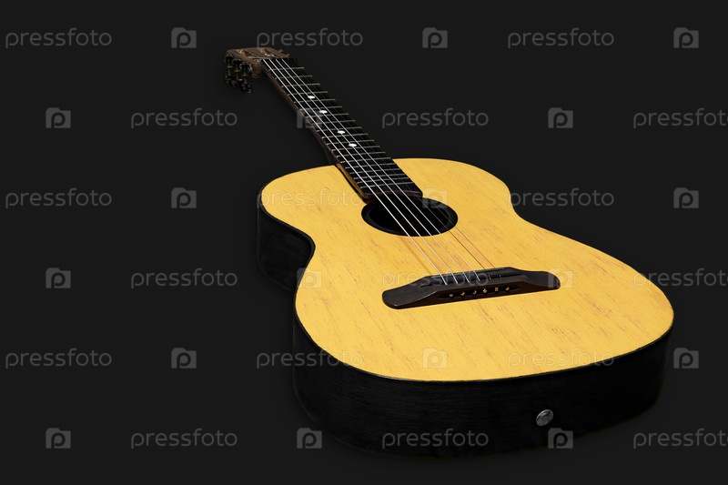 Акустическая гитара на темном фоне. Музыкальный струнный инструмент