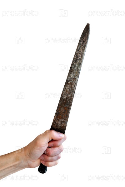 Старый ржавый поварской нож в руке мужчины на изолированном белом фоне. Концепция восстановления найденных объектов. Коррозия металла. Поврежденные столовые приборы