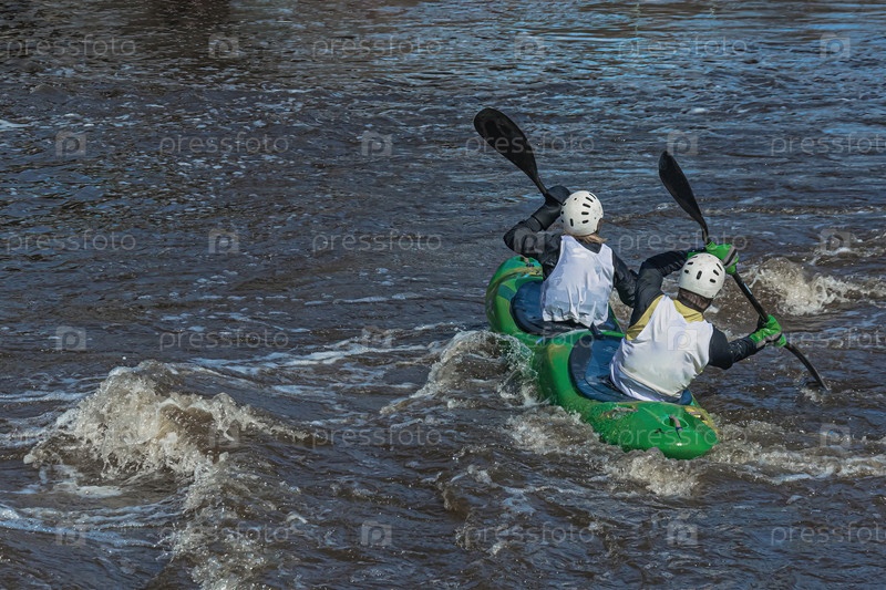 Серия изображений. Спортсмены на байдарках и байдарках покоряют бурные воды реки. Одет в водонепроницаемую одежду и шлемы. В руках они держат весло. Размытость