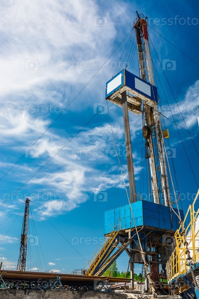 Мобильная буровая установка для бурения нефтяных и газовых скважин. На фоне голубого неба. Бурильные трубы расположены рядом с буровой