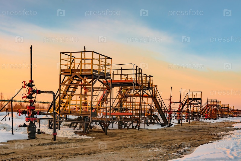 Нефтяные добывающие скважины расположены в ряд на нефтяном месторождении в Западной Сибири. Закат весенний солнечный день
