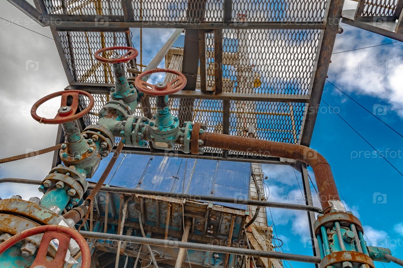Фонтанная арматура нефтяных скважин. Трубопроводы и оборудование высокого давления. Сквозь решетчатый пол сервисной платформы на заднем плане видна буровая установка
