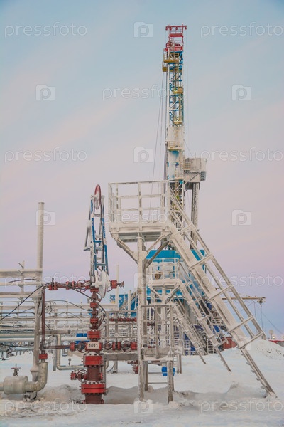 Оборудование и инфраструктура для добычи газа из скважин арктического месторождения. Зимний полярный день. Буровая установка на заднем плане