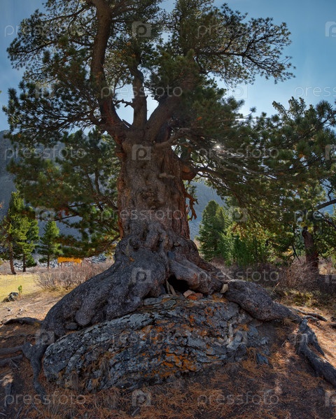 Россия, Горный Алтай. Объемный вид на пушистый кедр с мощной корневой системой в долине реки Актру