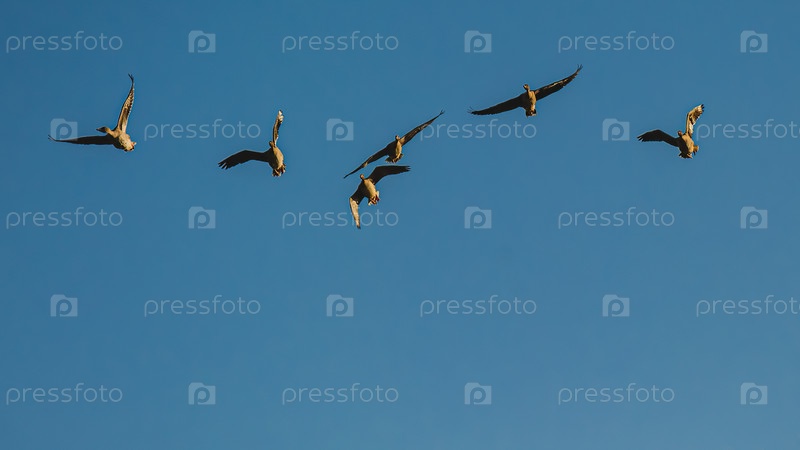 Стая диких гусей летит на фоне голубого неба
