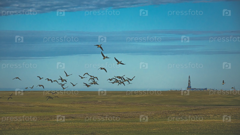 Стая диких гусей летит над северной летней тундрой на фоне голубого неба