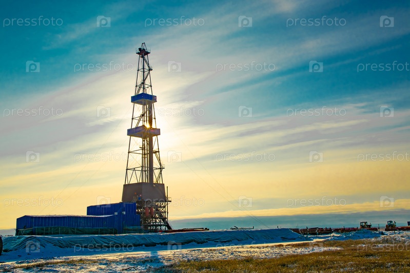 Буровая установка для добычи нефти и газа в северной тундре. Начало зимы в Арктике. Солнце сверкает сквозь нефтяную вышку