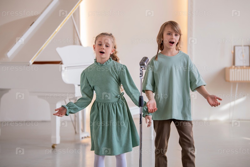 Двое детей поют в микрофон на фоне белого фортепиано. На одном зеленое платье, на другом зеленая рубашка