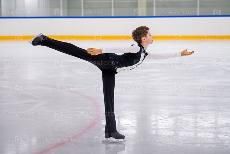 Мальчик катается на льду с вытянутыми руками. На нем черный костюм, и он выполняет трюк