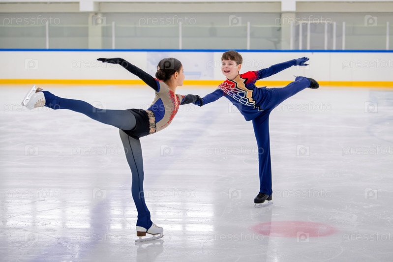 Юноша и девочка-фигуристы исполняют номер на льду